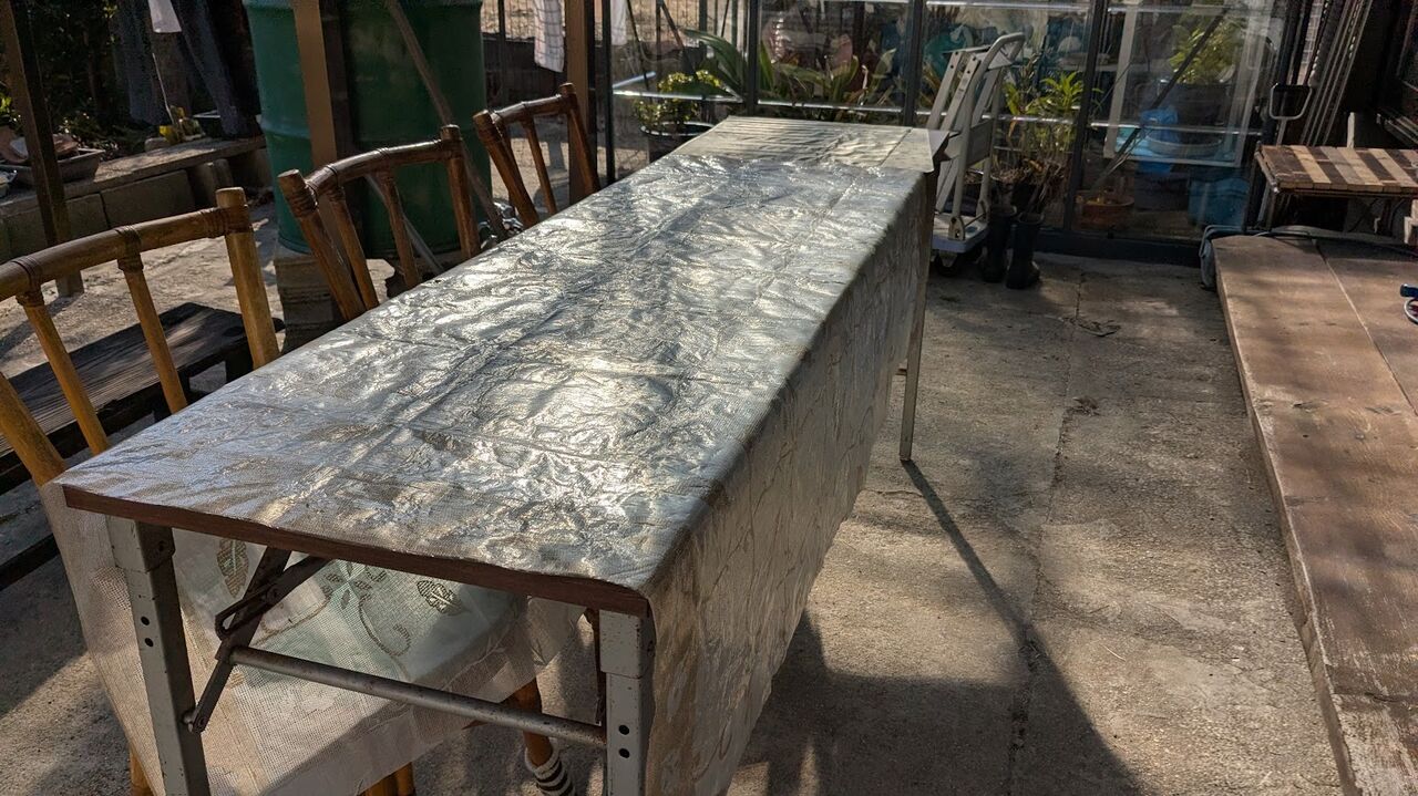 急遽 洗濯物が干してあるテラスで、テーブルとイスの用意をしました