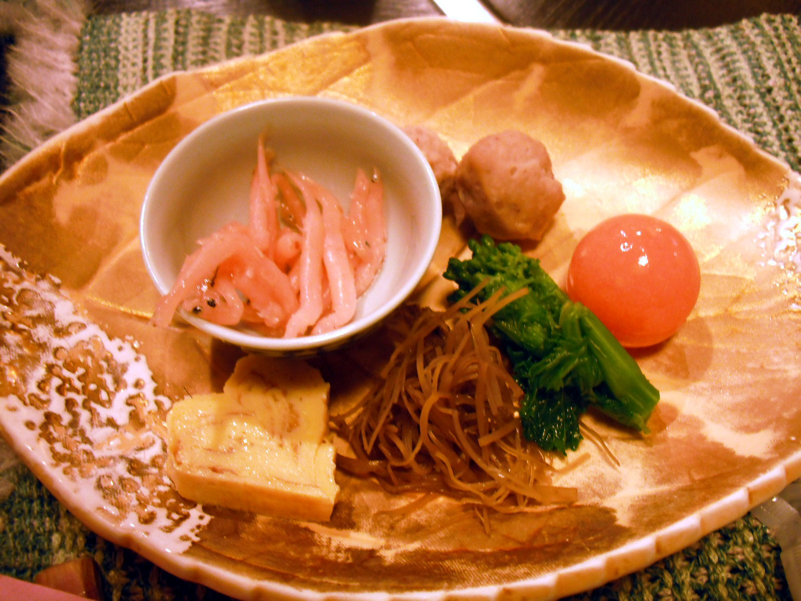 黄色く丸いのは玉子の黄身かと思って食べたらトマトの甘酢かな?でした