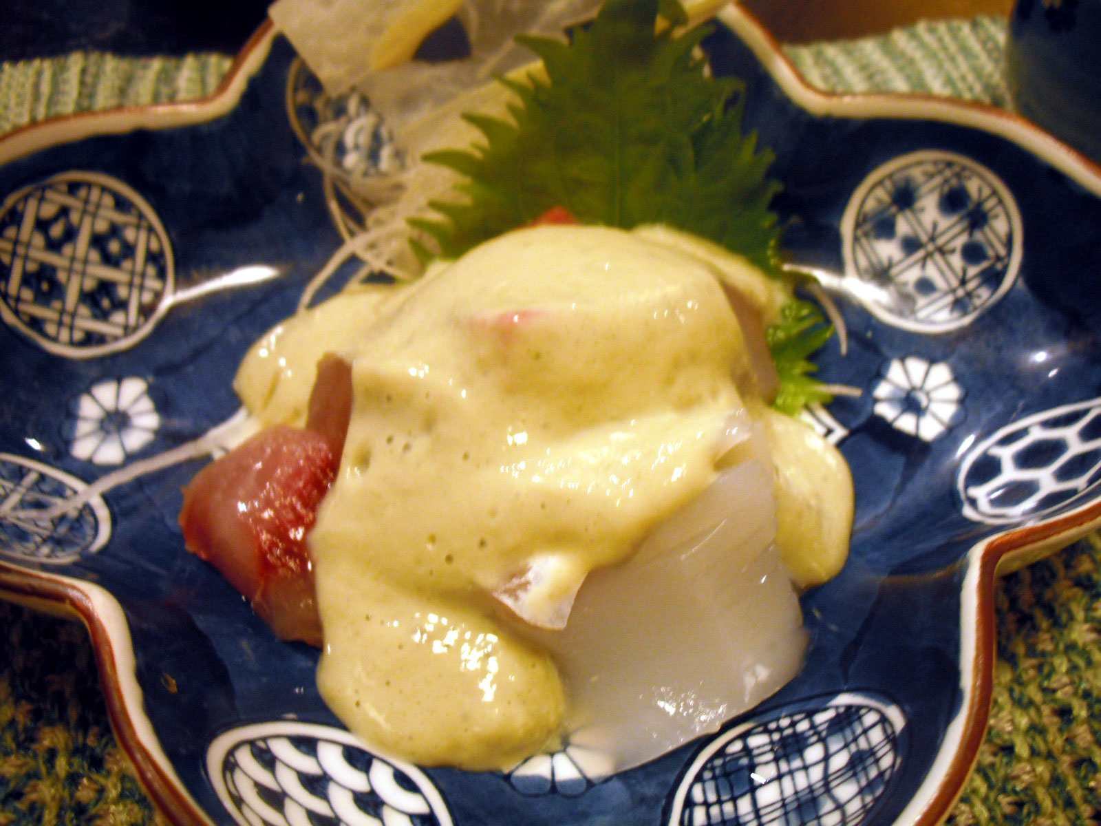 烏賊とマグロとカンパチ?の刺身です。上にかかったものは、お豆腐を、わさびとお醤油で味付けしたものだそうです。初めての食感!わさびの風味も良かったですよ~