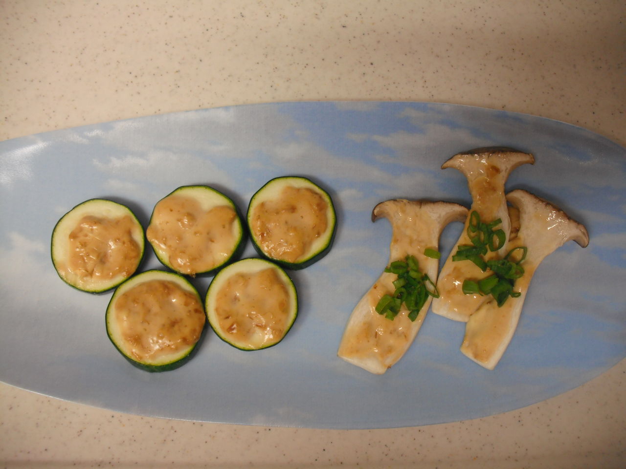 ズッキーニに、マヨネーズに少量のお醤油、鰹節を混ぜた物を乗せて焼くだけ