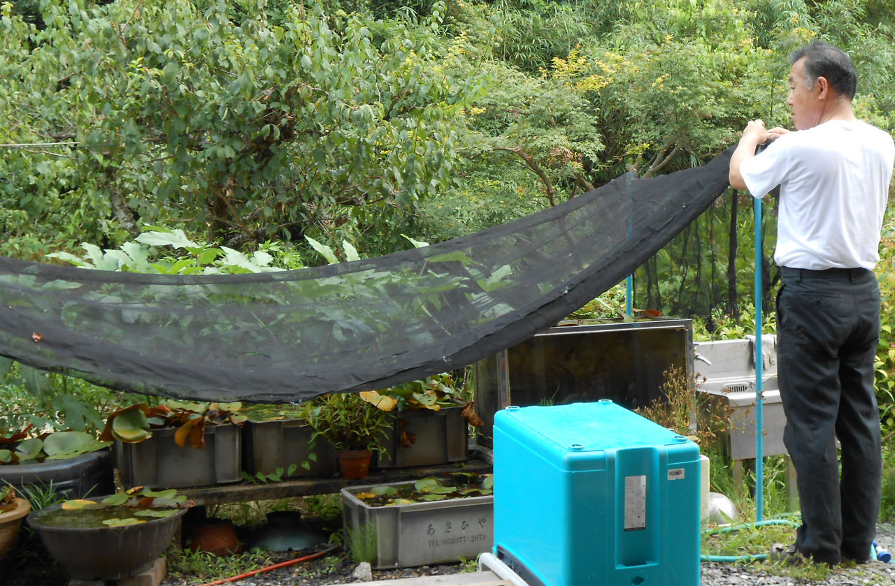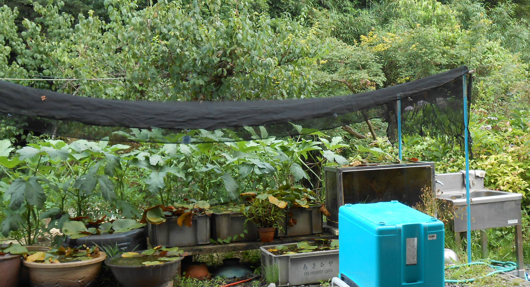睡蓮鉢の中には、娘が大事にするメダカが泳いでます
