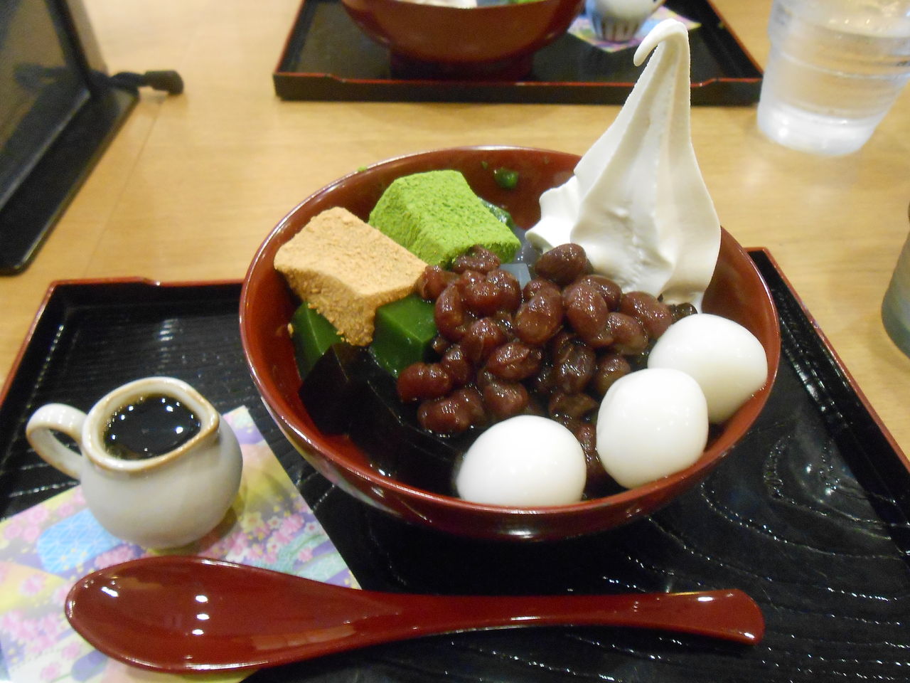 小豆。 蕨もち。抹茶ゼリー。黒糖ゼリー