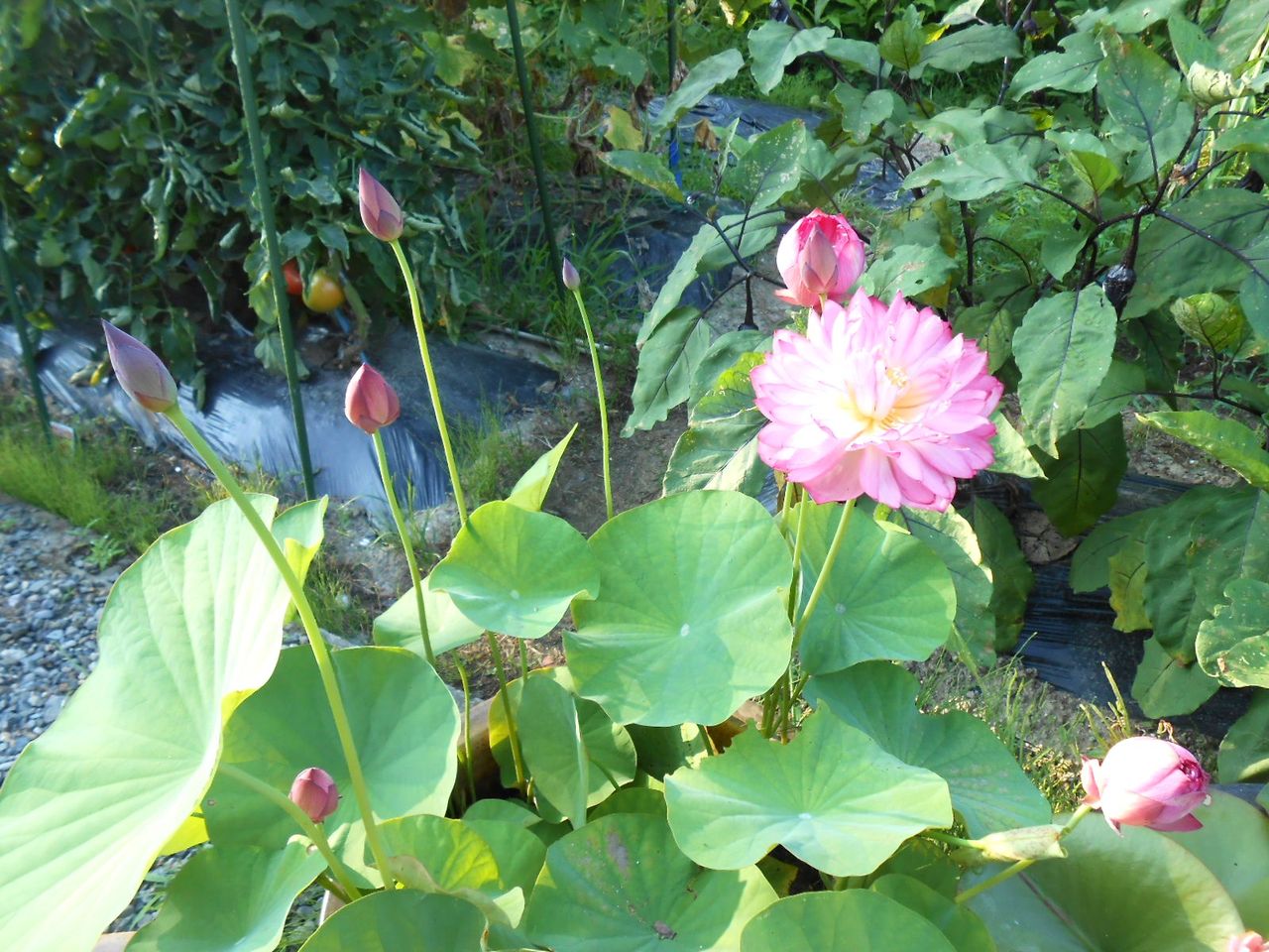 チューリップの様な蕾もたくさんしばらく、次々に咲く蓮を楽しめそうです
