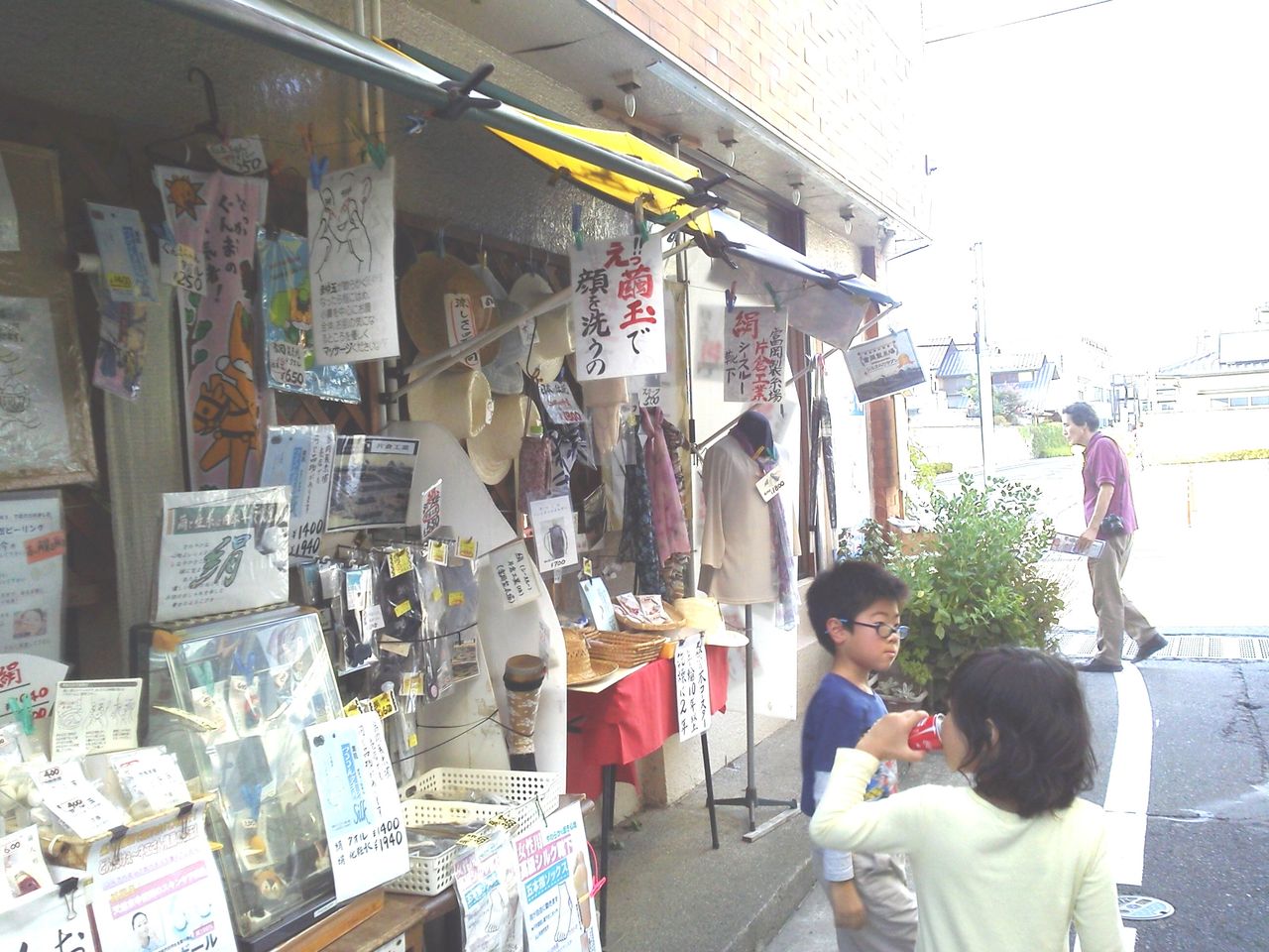人通りを目的に、にわかに出来たであろう簡易的なお店がつながります(スポーツ用品店。飲食店。洋品店など、お店の前の空きスペースに、土産物などが並んでいます)