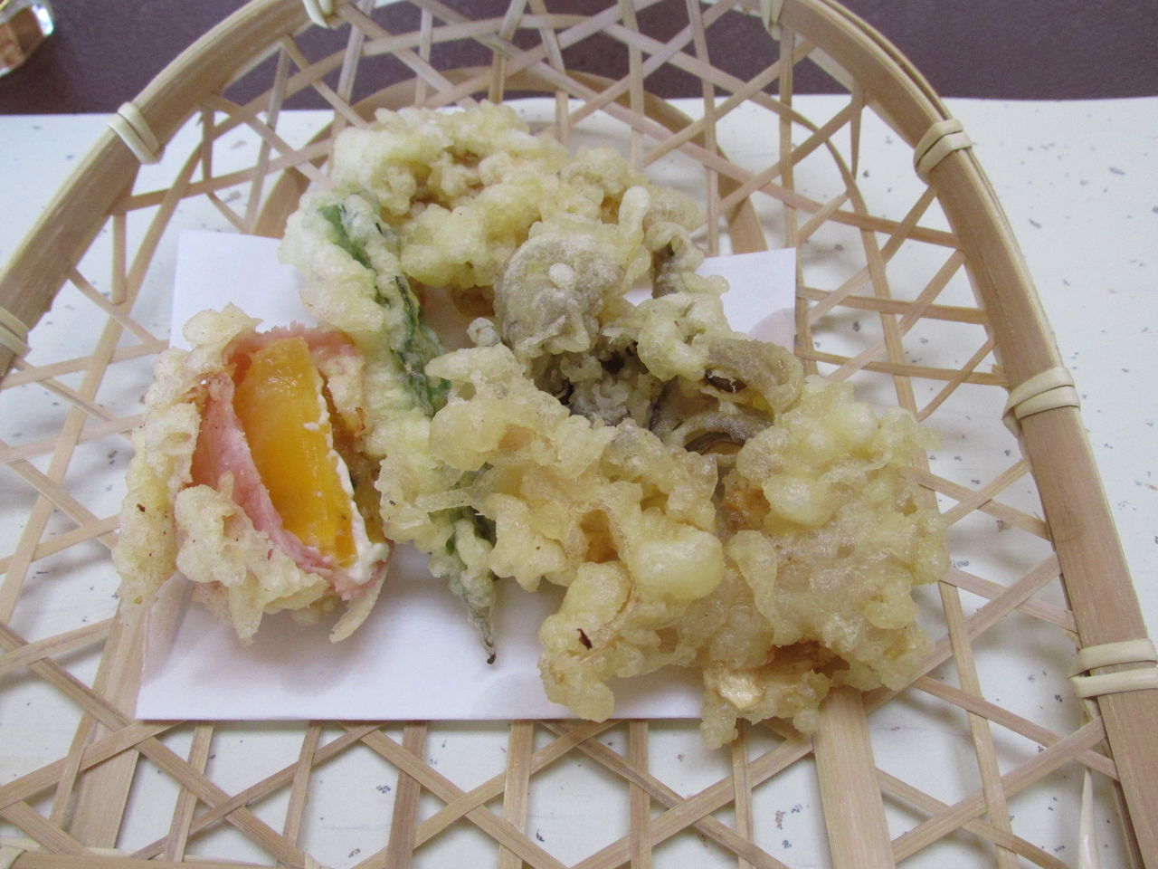 きのこ3種の天ぷらと、柿にクリームチーズがサンドされ、