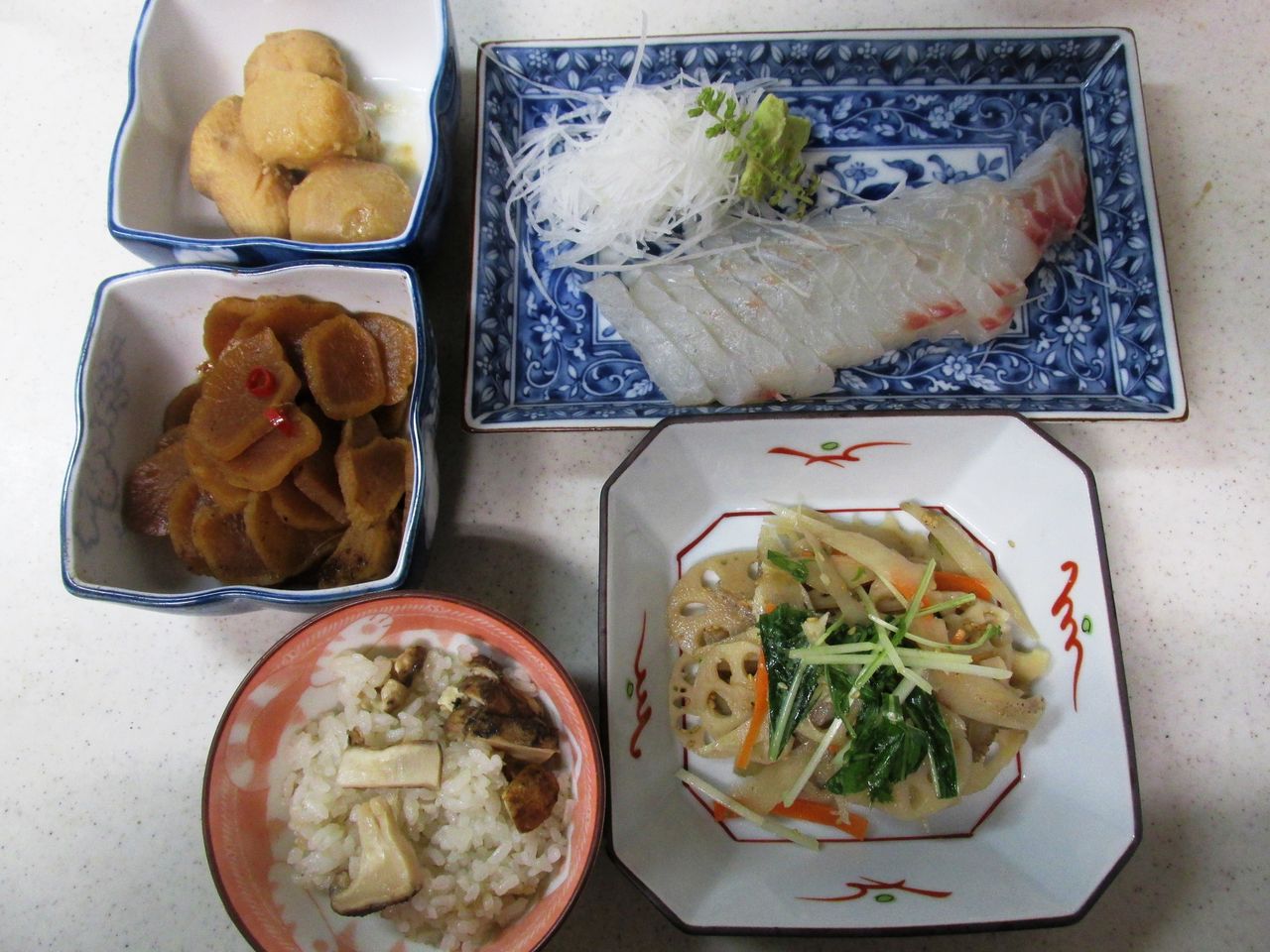 里いもの煮っ転がし(前日の残り)。鯛のお刺身。