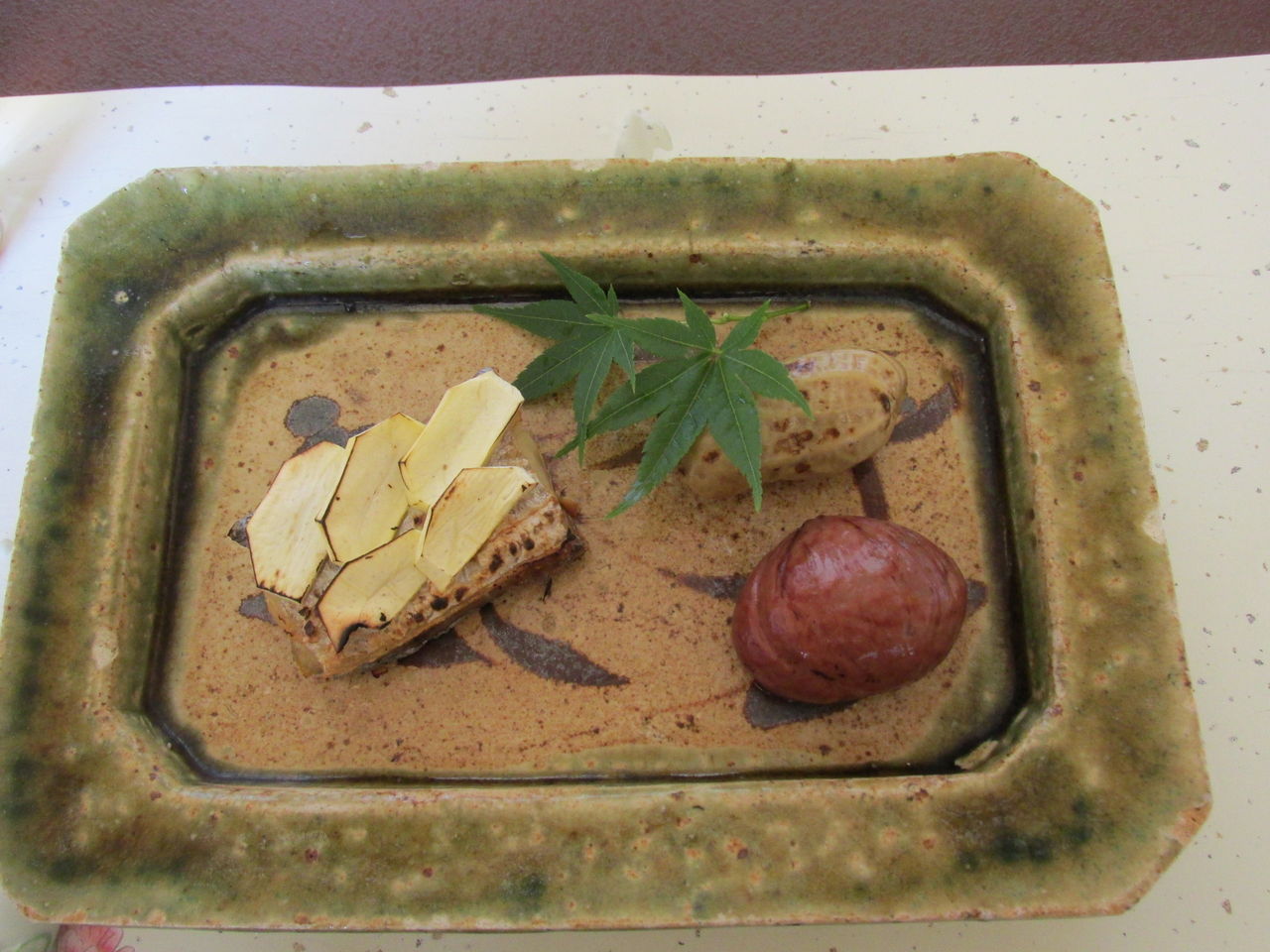 お魚の切り身の上に、栗をうすくスライスして焼いていただいてありました