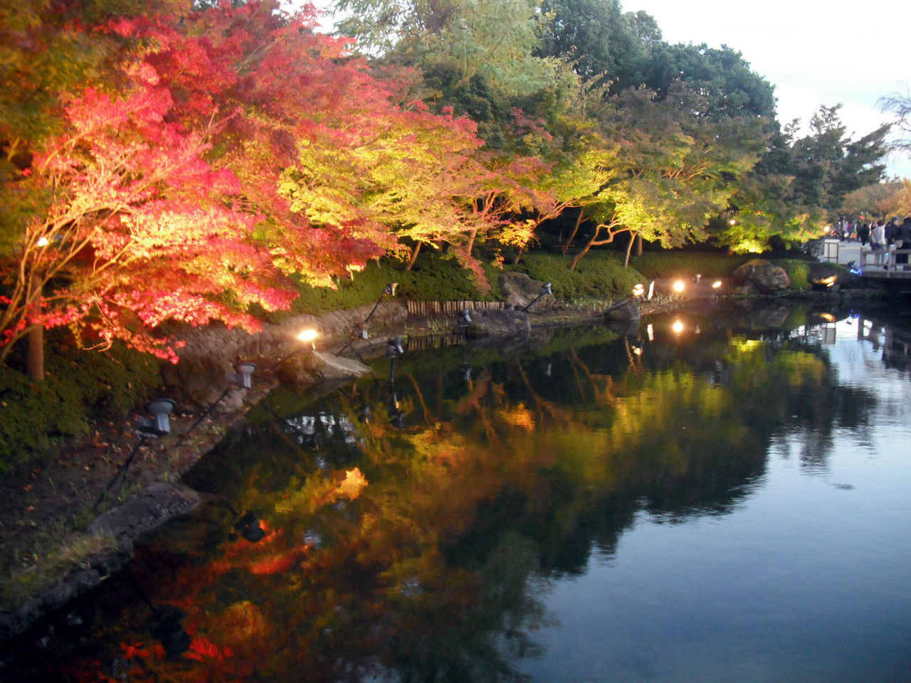 鏡池の紅葉も秋色に色を染め、ライトアップでとびっきりの見ごろに変身!