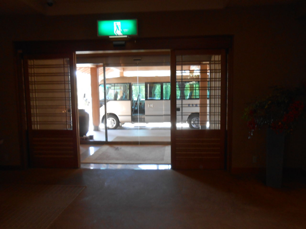 玄関の前に送迎用のマイクロバスがスタンバイ。