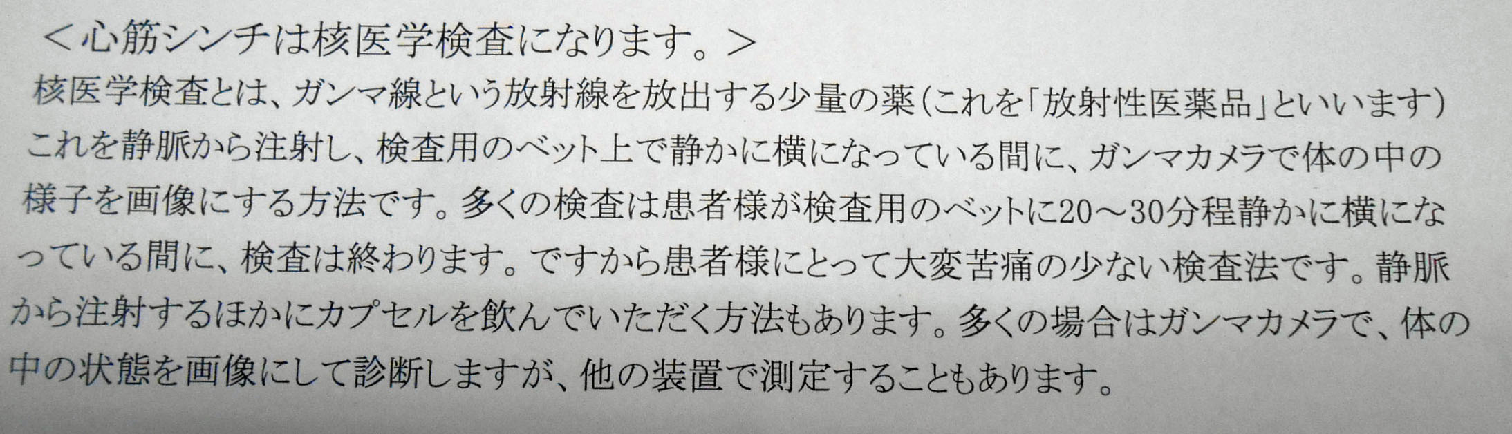 ということで、次回、負荷心筋シンチ の検査を受けることになりました