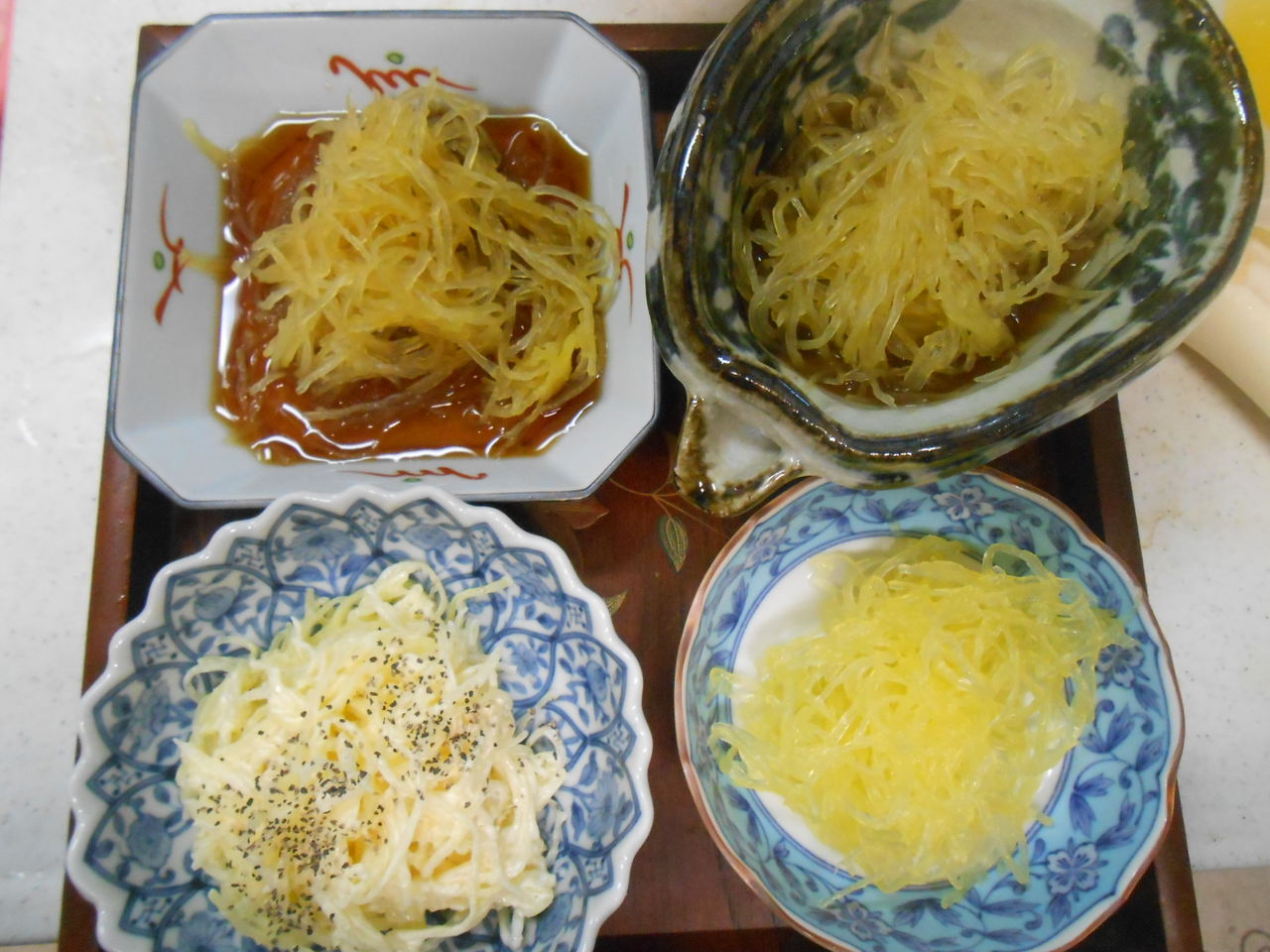 普通は三杯酢などで和えるのですが、今回、いろいろと作ってみました