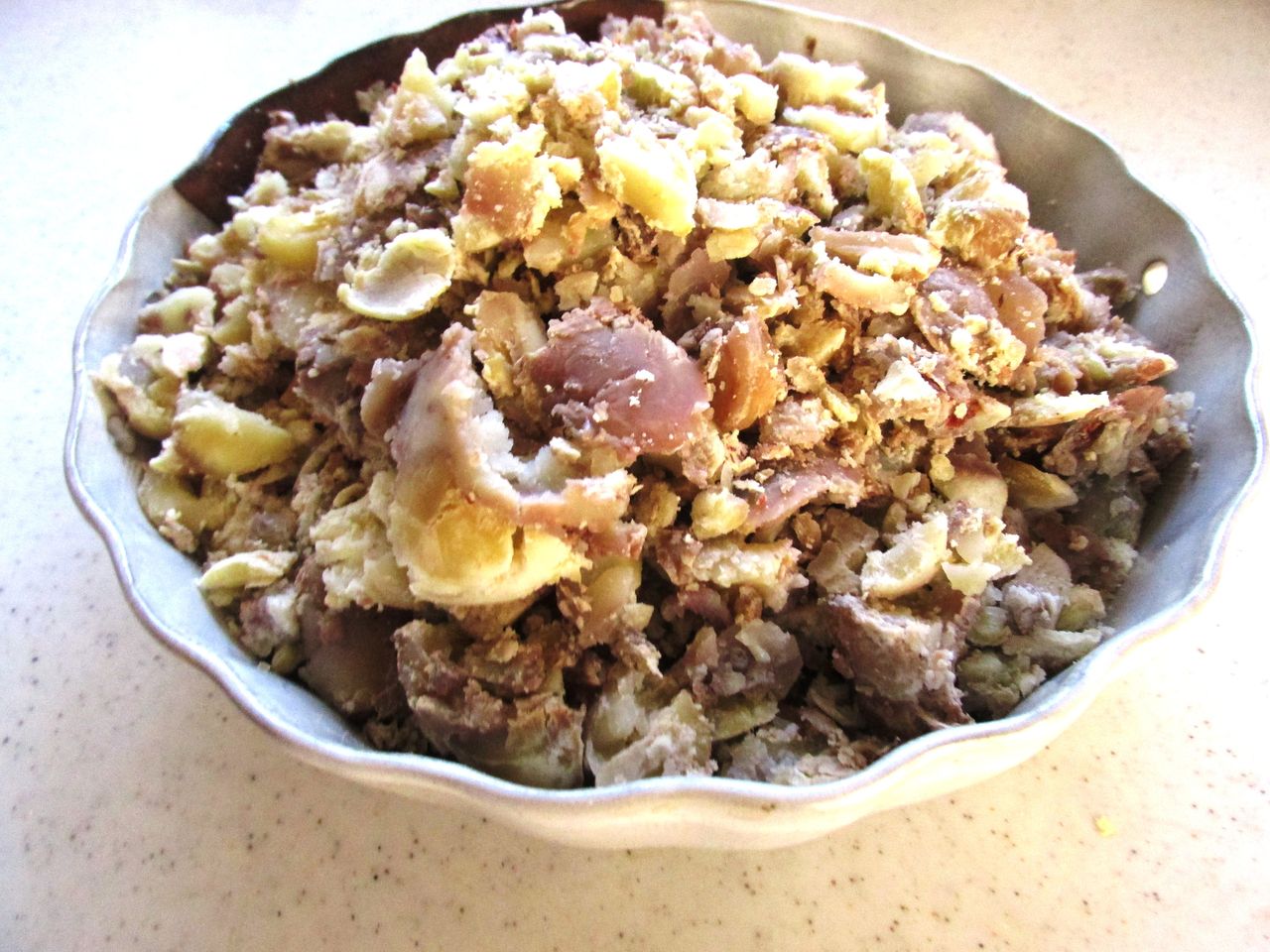 鬼皮は柔らかいので、むきやすい。渋皮をつけたまま、素揚げにしたらいかがでしょう。私はそうしてますよ。山栗の場合ね
