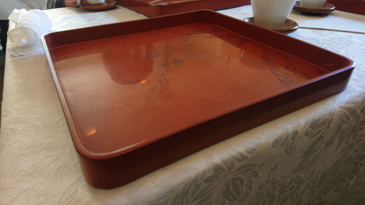 プラスチックのものではなく、重厚な感じの木製の塗りの正角盆