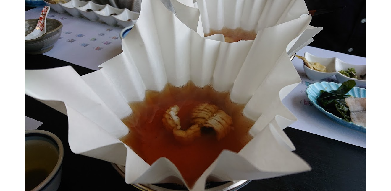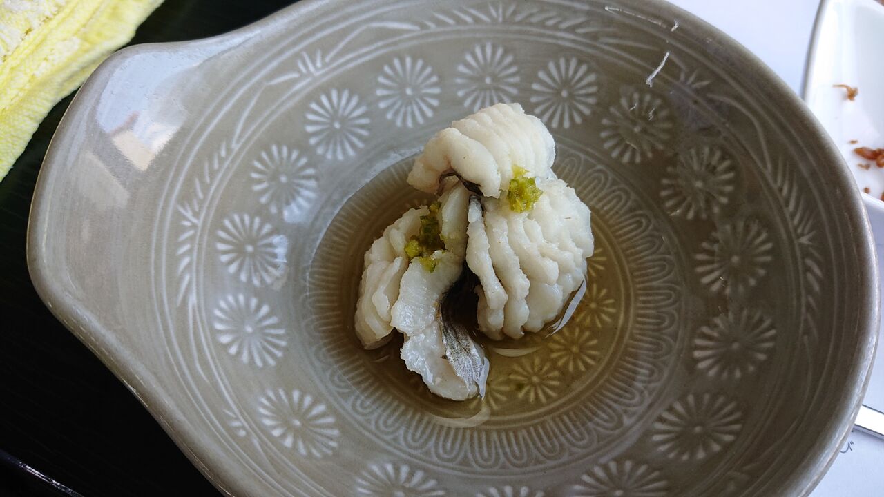 鱧のしゃぶしゃぶです。すでに2切れはお出汁の中に。↓