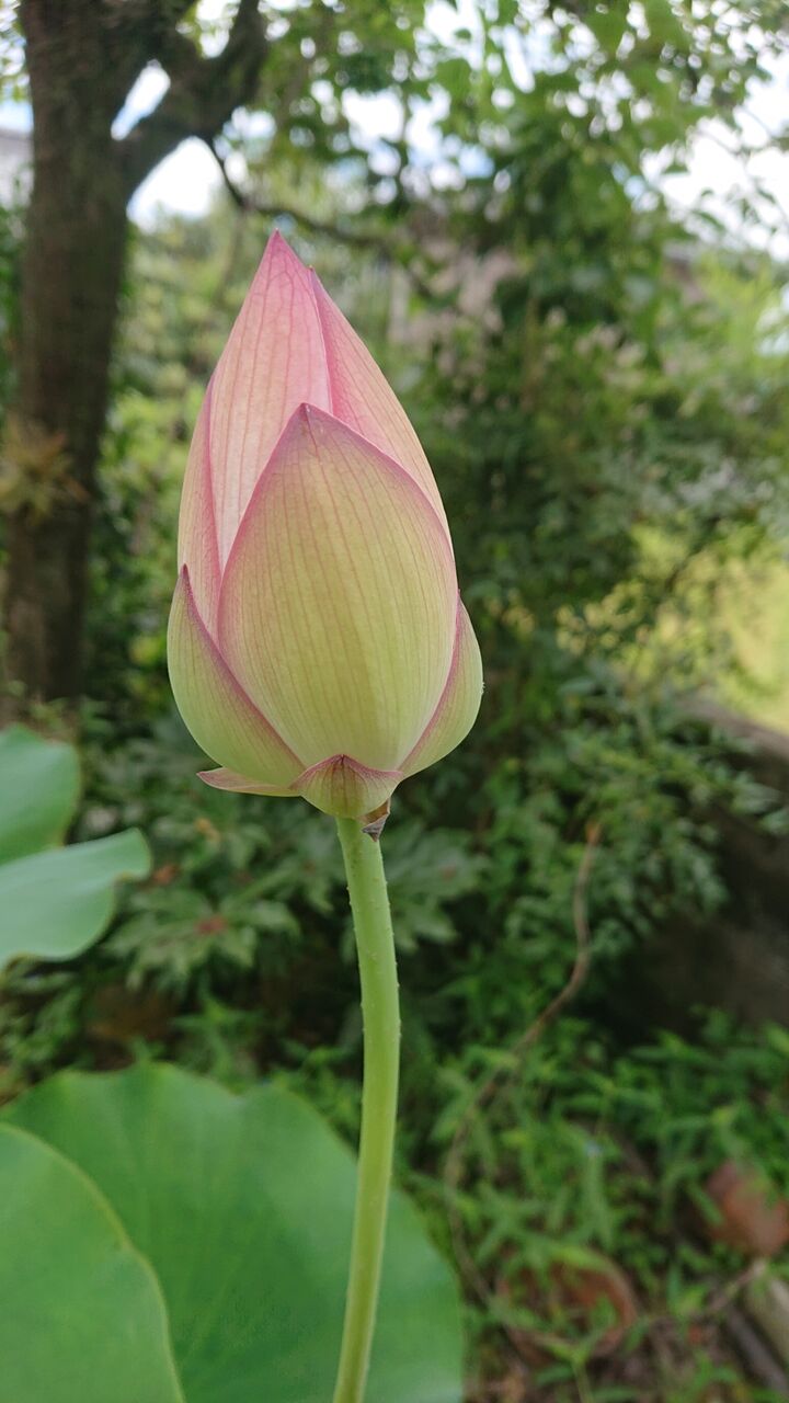 固い蕾だった自宅の蓮の花。今朝には少し開き出しました