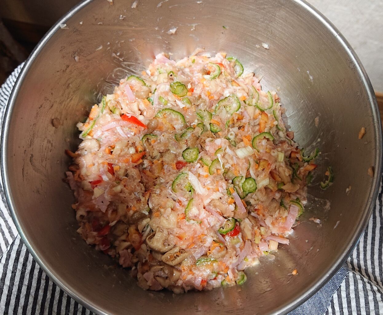 鶏ひき肉に、適当に野菜。。ベーコン(必須です)
