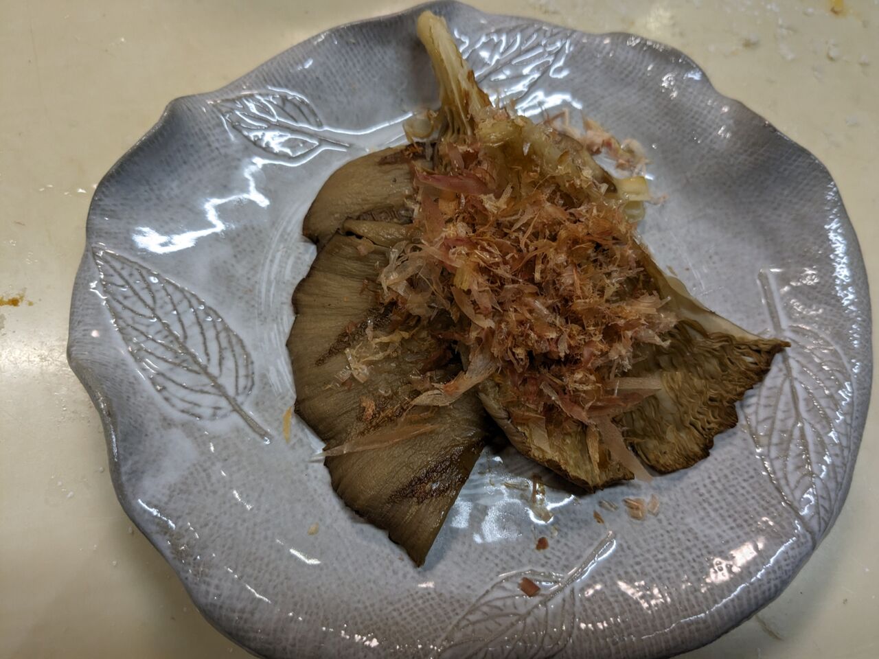 ヒラタケの焼いたの、おいしそうですね。シンプルが一番ね。きのう、万願寺唐辛子を焼いて、おかかとしょうゆでたべたんです。シンプルでおいしかったわぁ。
