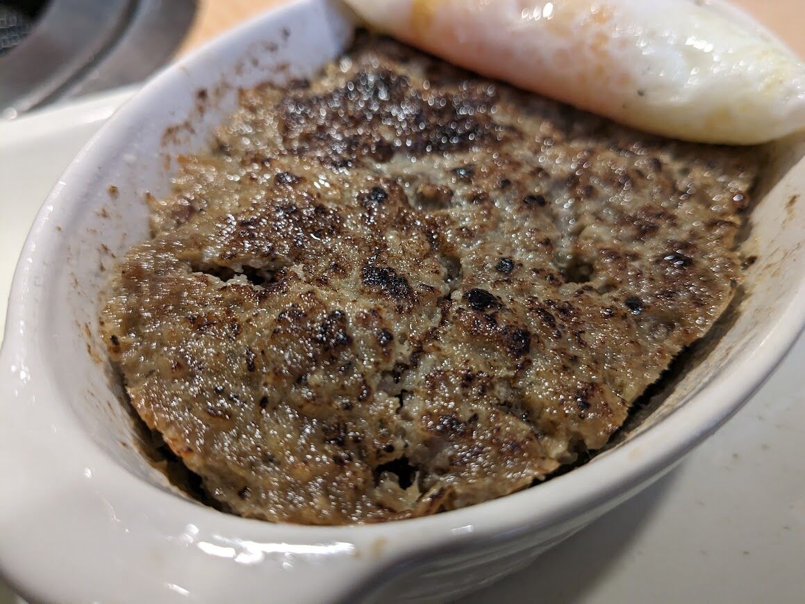 小さなグラタン皿にミンチを敷いて焼いたもの