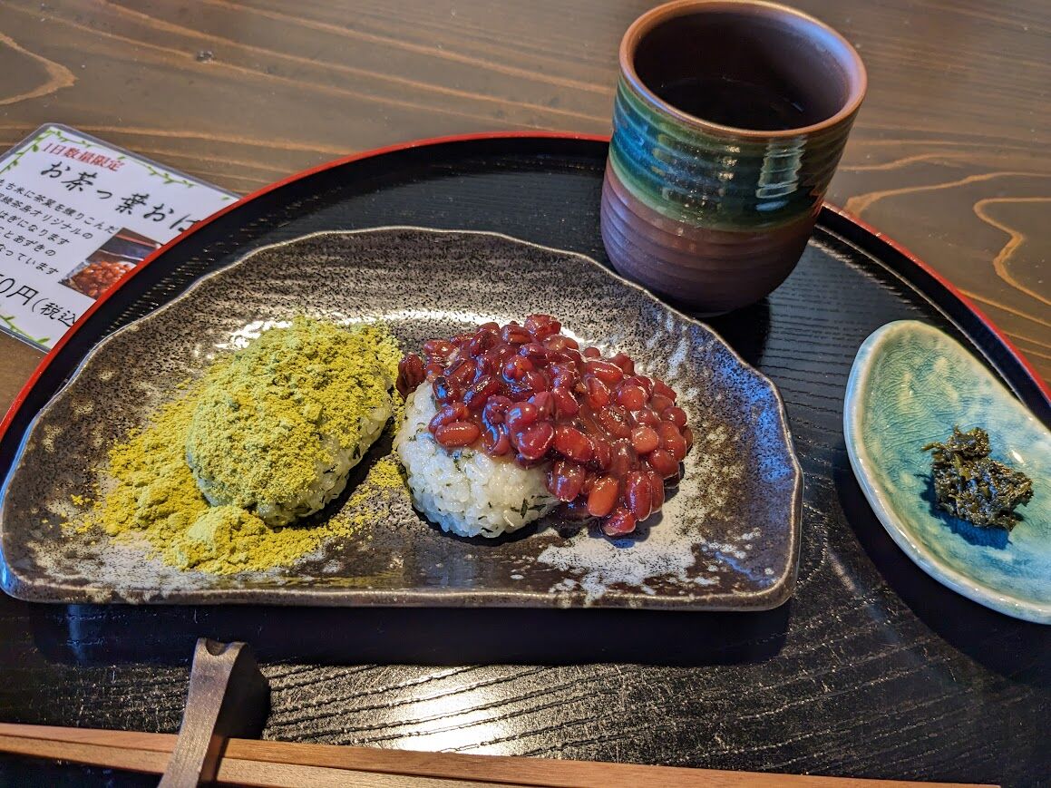 ご飯に茶葉が混ぜてあり小豆が掛かったもの。