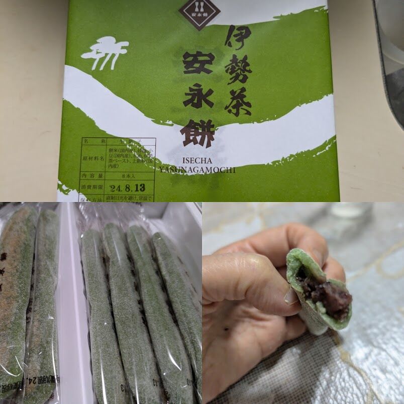 一見、よもぎ餅の様ですが、伊勢茶が練り込まれたお餅です