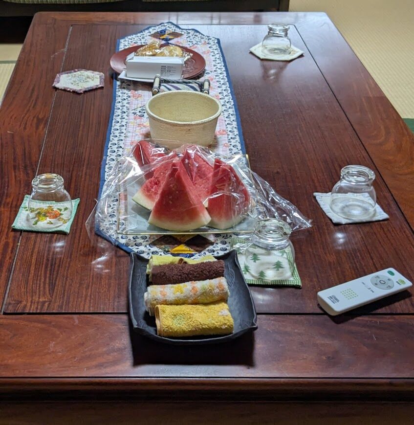 西瓜を切って、とうもろこしを茹でて・・