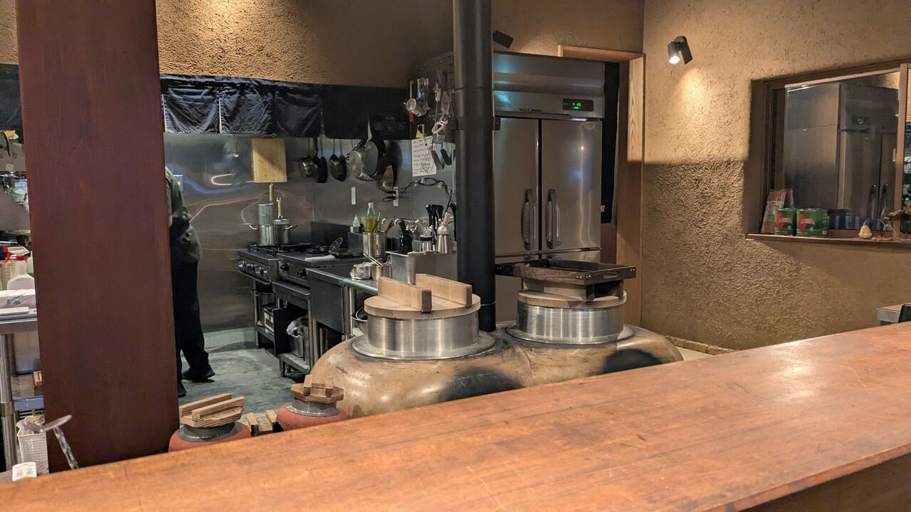 カウンターの中には、大きなカマド