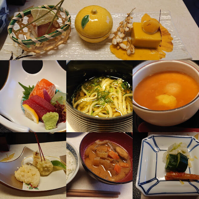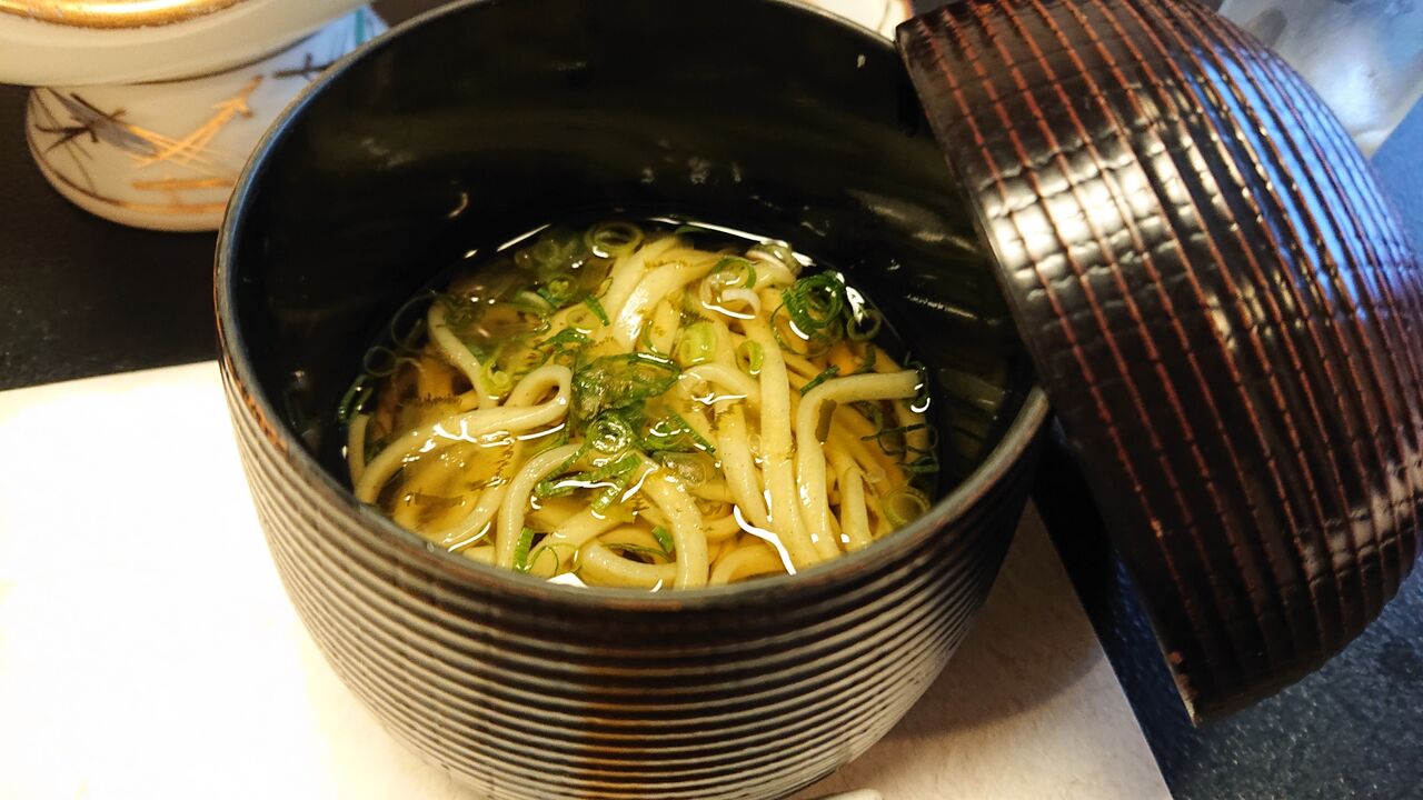 大きな朱りの桶に入ったランチ。